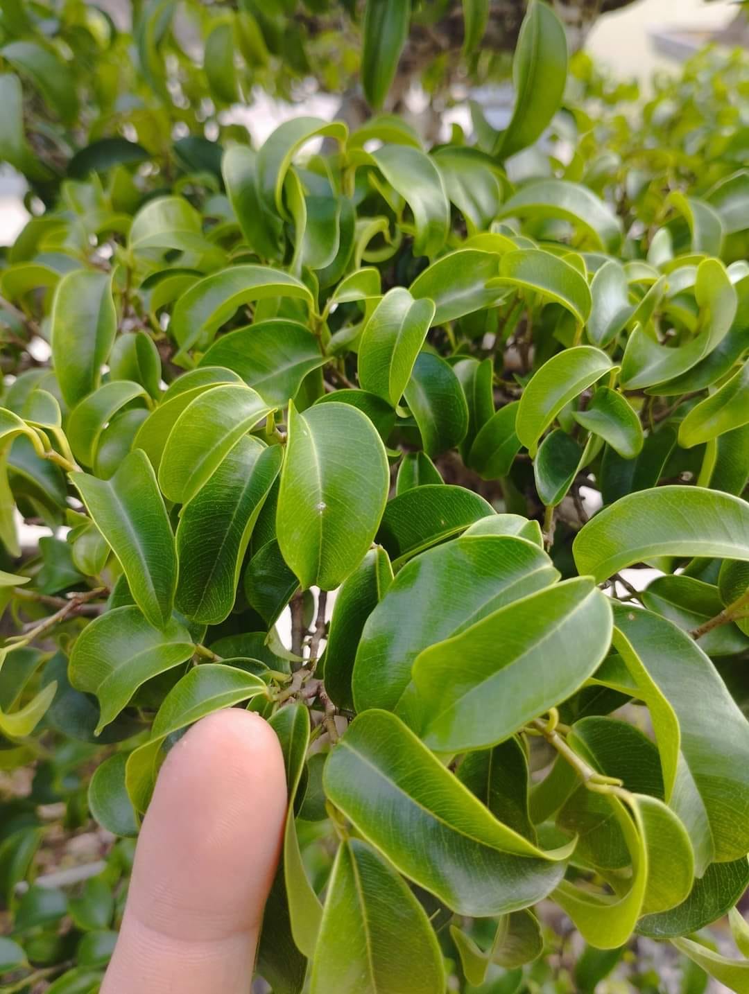 Theo các chuyên gia về cây cảnh, loài cây này đẹp nhất ở phần lá. Chúng có lá dày và xanh tốt. Lá non màu trắng, rất mỏng và có thể nhìn xuyên thấu từ mặt này sang mặt khác. Khi lá già sẽ ngả sang màu xanh đậm. Bề mặt lá nhẵn và có mép lá nguyên. Lá có kích thước nhỏ, dài từ 2 đến 5cm và rộng từ 2 đến 2.5cm. Ngoài ra, mật độ lá dày tạo nên những tán xum xuê và xanh mướt.
